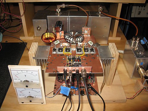 prototype 137 kHz deck shows the rather ugly construction details. The overload shutdown board is mounted on the lower level of the test fixture. Prototypes are alot more fun than the finished product as almost 'anything goes' construction wise while exploring all of the 'what ifs'. This deck was operated for well over a year just as seen in the photo - unshielded and out in the open. No interference problems were noted.