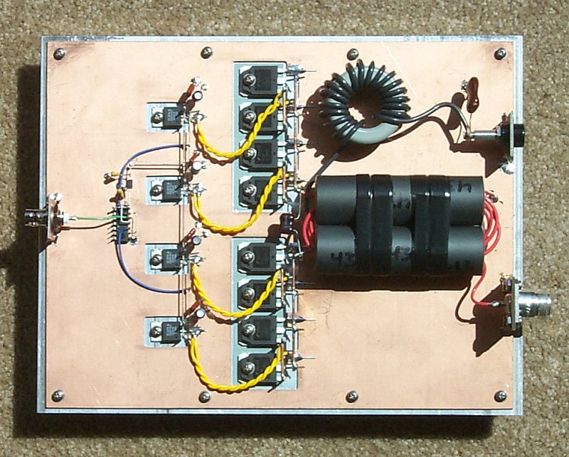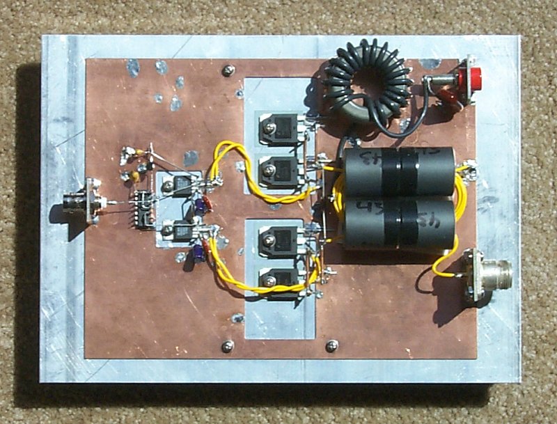 Click on image for larger view. Again, nothing special in the construction of the breadboard. This deck started out as the 100-watt version. The only differences being two less 11N90s, two less ferrite cores and a different transformer ratio. All three transmitters are very similar. |